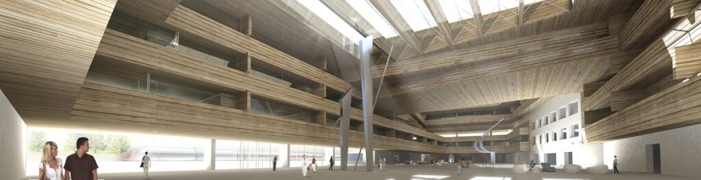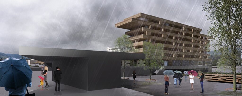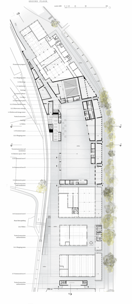 Una nueva arquitectura de madera se inserta cuidadosamente, “redibujando” los límites del conjunto edificado. Se trata de una arquitectura de borde que va enlazando fragmentos y va estableciendo relaciones distintas en función de lo que se encuentra; a veces se enrolla sobre sí misma para albergar un espacio público, a veces se adosa a los bordes comerciales, otras veces se convierte en pérgola…. El objetivo primordial es producir conexiones, espacios de intercambio y de comunicación.