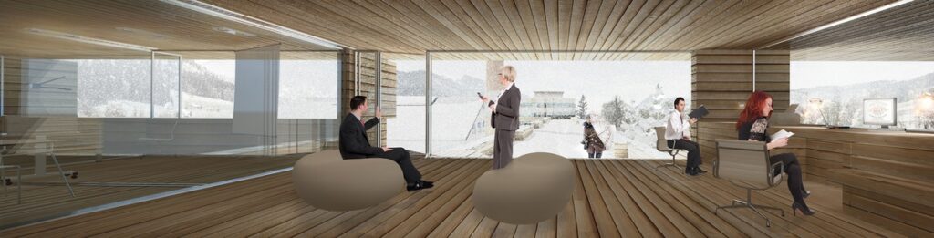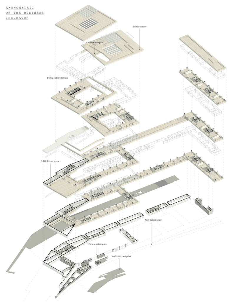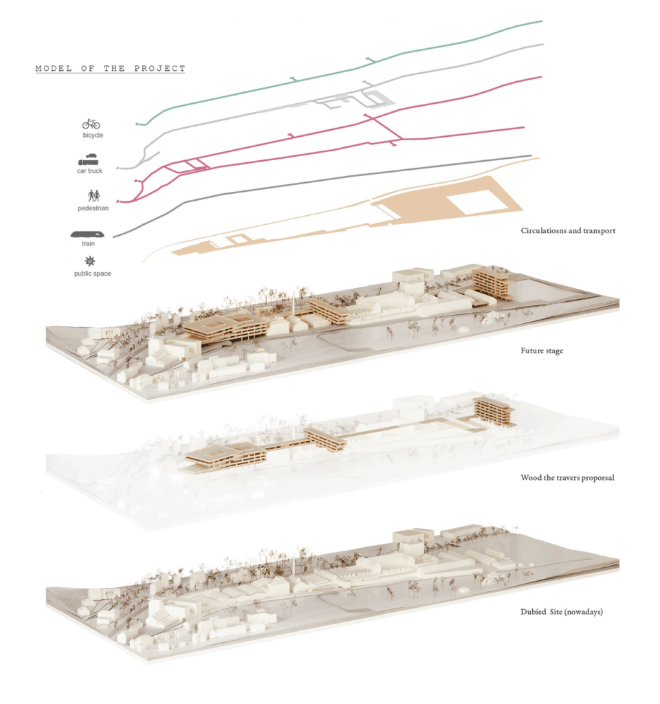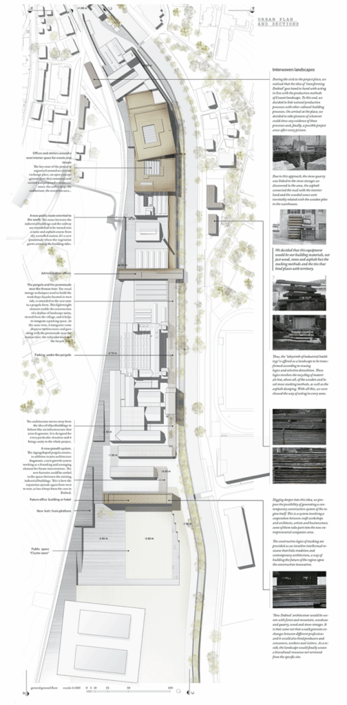 De esta forma, el “laberinto de naves” industriales se ofrece como un paisaje a transformar según lógicas de reutilización y demolición selectiva. Estas lógicas implican el reciclaje de materiales pero, sobre todo, de las estrategias de apilamiento de la madera y la piedra de la cultura local, así como el vertido del asfalto, indicándonos cómo actuar en cada sitio. Ahondando aún más en esta idea, proponemos la posibilidad de generar un sistema constructivo contemporáneo y genuino de la región, un sistema que pueda producirse en colaboración entre arquitectos y talleres artesanales avanzados, artistas y empresarios, algunos de ellos insertados en la nueva área de empresas emprendedoras. Las lógicas constructivas del apilamiento se ofrecen como un recurso intelectual intuitivo que vincula tradición y arquitectura contemporánea; un modo de construir el futuro de la región a partir de la innovación constructiva. La arquitectura de “la nueva Dubied” quedaría así entrelazada con el bosque y la montaña, con la sierra de talado y con la cantera, con los almacenes de madera y de piedra. Se trata de la misma red que produciría intercambios entre distintas profesiones pero, además, enlazaría productores y consumidores, trabajadores . El paisaje resultante terminaría tejiendo al final una red de recursos bio-culturales extraídos desde el sitio específico.