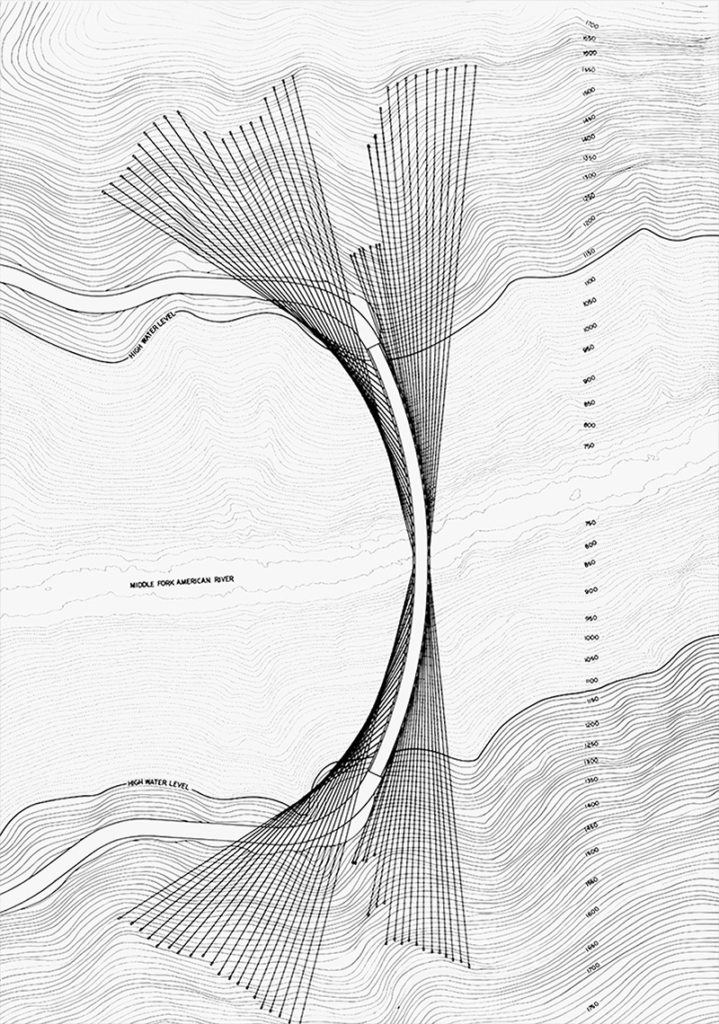 In 1978, SOM architect Myron Goldsmith and engineer T.Y. Lin created a remarkable structure to span the challenging middle fork of California’s American River. Ruck-A-Chucky Bridge elegantly solves the problem of building a stable, economical structure across a wide, steep gorge by entirely rethinking the principles of bridge-building. A “hanging arc,” the bridge was to be suspended by 80 high-strength cables and balanced by tensile forces. Though unbuilt, Ruck-A-Chucky Bridge stands as a masterwork of innovative design and structural economy to this day. Learn more